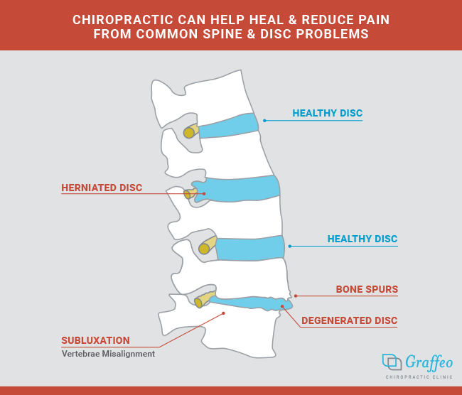 If the spine is injured, it can result in degenerated discs, herniated discs, bone spurs and vertebrae misalignment, known as subluxation: