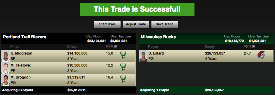 Trade 2 — Brogdon/Middleton/Teletovic for Lillard