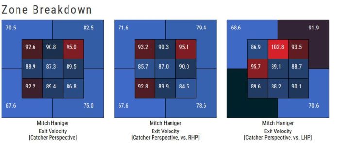 Over at Baseball Savant, the only publicly available Statcast data source, it shows that Haniger is destroying left handers who leave the ball up and in the middle. The exit velocity in that zone is a red hot 102.8 mph. That’s a full 12.5 mph difference when the pitch comes from a right hander. The inner third has also been a feasting ground for Haniger against southpaws, sending the ball the other way at 95.7 mph, compared to 85.7 mph in the same location from a right hander.