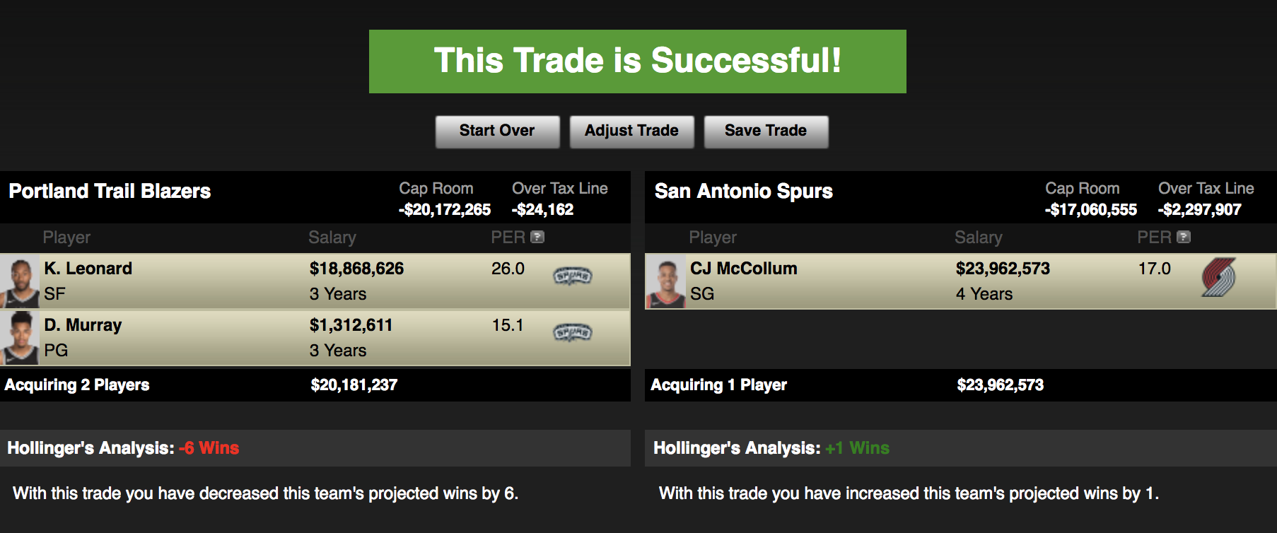 Acquiring the Blazers’ 2-guard instantly fixes the lack of modern-day shooting and scoring they have in the backcourt and better prepares them for the end of the Tony Parker-Manu Ginobili era. San Antonio would be able to slide Patty Mills back to his natural position at the 1 and let McCollum come off curls (as well as play de facto point guard in crucial moments).
