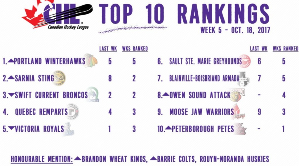 The Canadian Hockey League released its weekly updated rankings covering its sixty teams and it brings with it, a new number one. The Portland Winterhawks jumped from fifth overall to the number one spot, based mostly on an incredible run over the past two weeks. The Hawks are averaging nearly six goals per game while only allowing about two, which has made them the overwhelming favorite in the poll.
