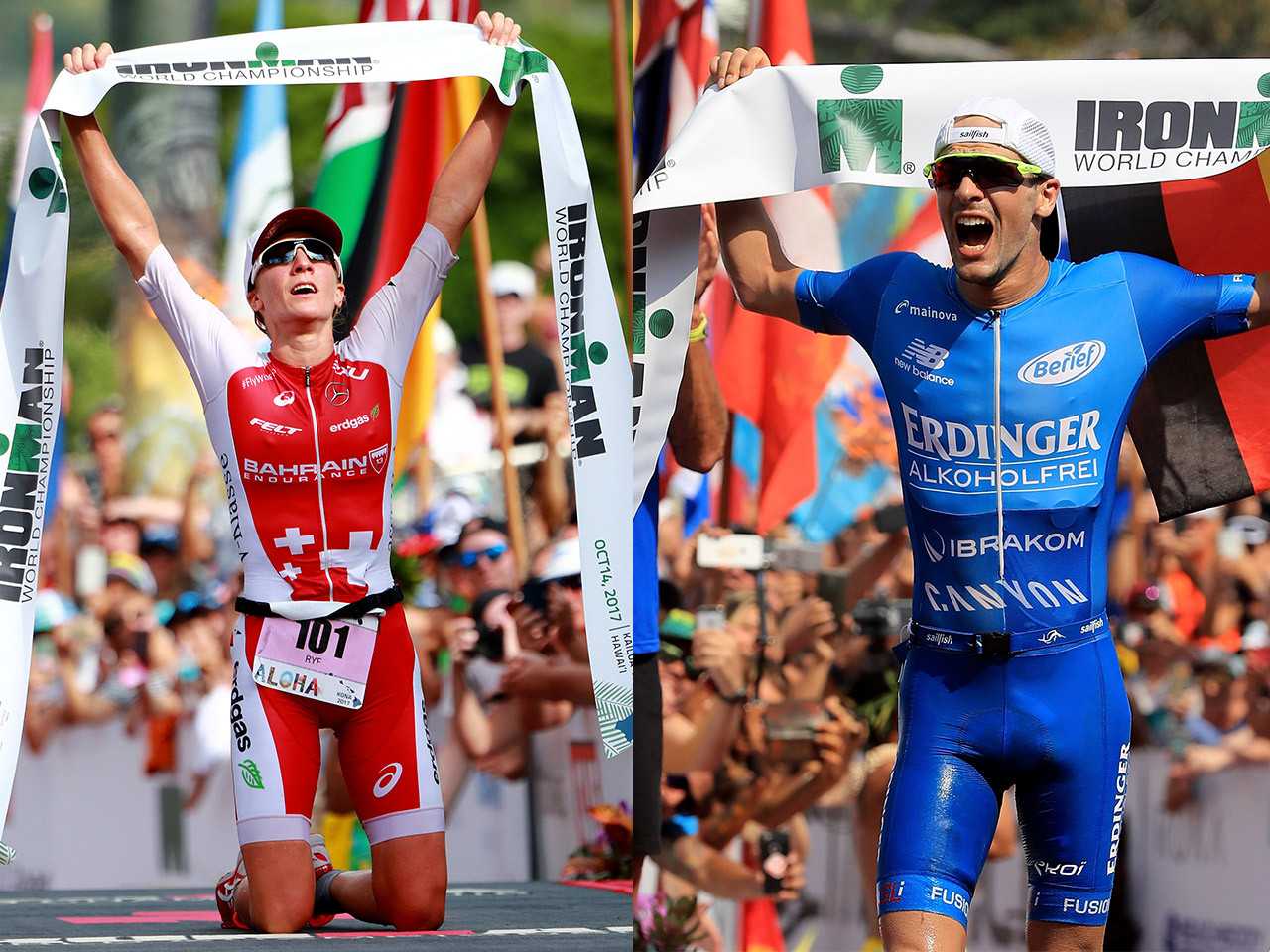 (Pictured: Ryf and Lange celebrate defending their titles at the world championships in Kona)