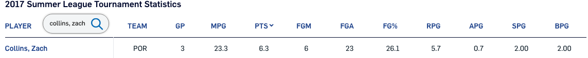 | Zach Collins | 7.6 | 30.0% | 6.7 | 1.3 | 4.0 |