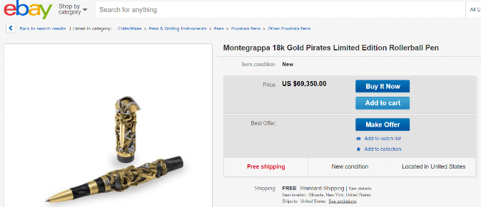 For His Wife: 18k Gold Pirates Limited Edition Rollerball Pen. $69,350 on eBay.